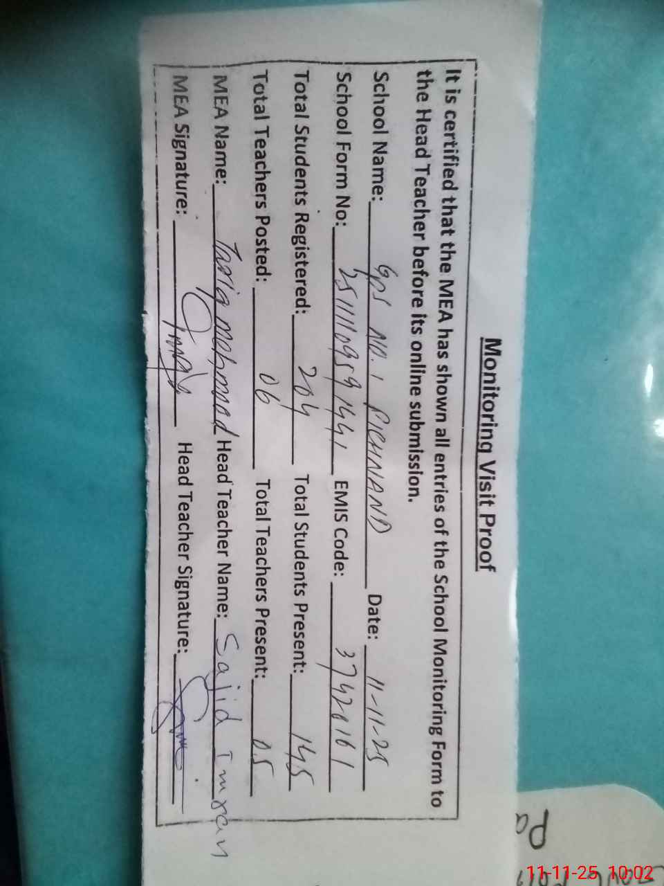 | Attendance Register | Head Teacher | MEA with School | Visit Proof |