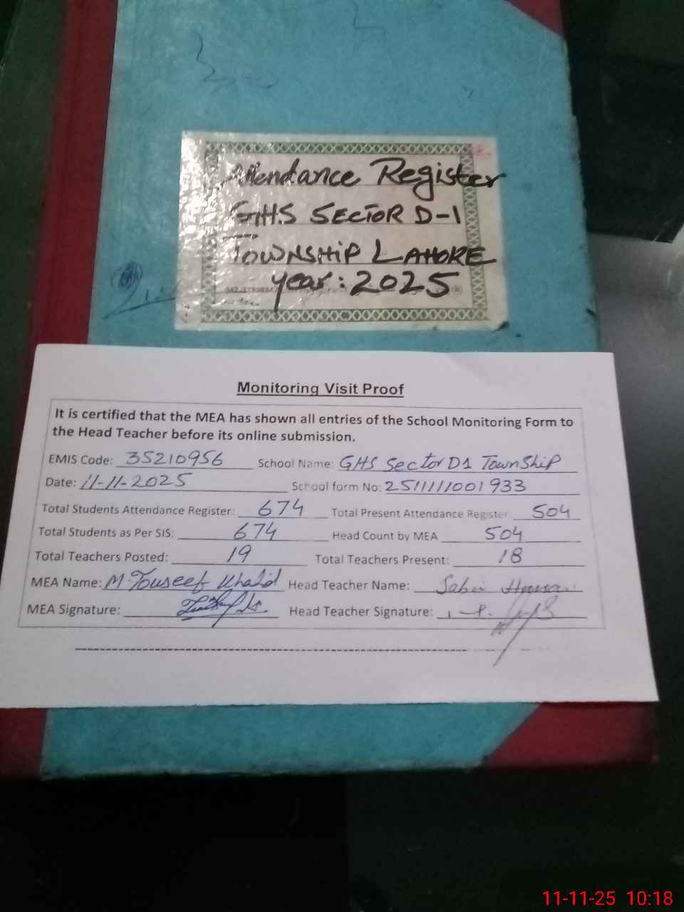 | EMIS Code: 35210956 | Name of School: GHS SECTOR D-1 TOWNSHIP | |||