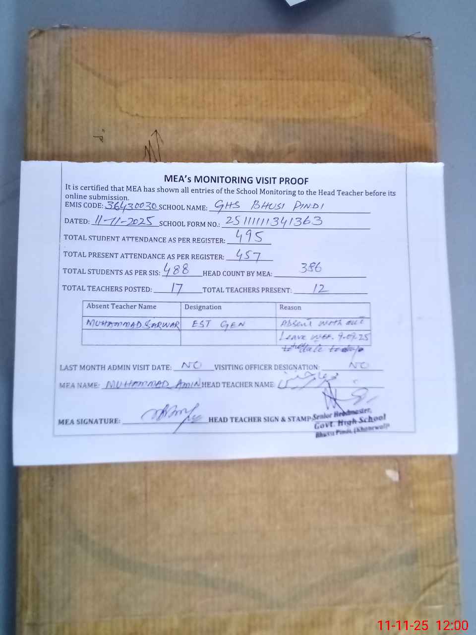 | Attendance Register | Head Teacher | MEA with School | Visit Proof |