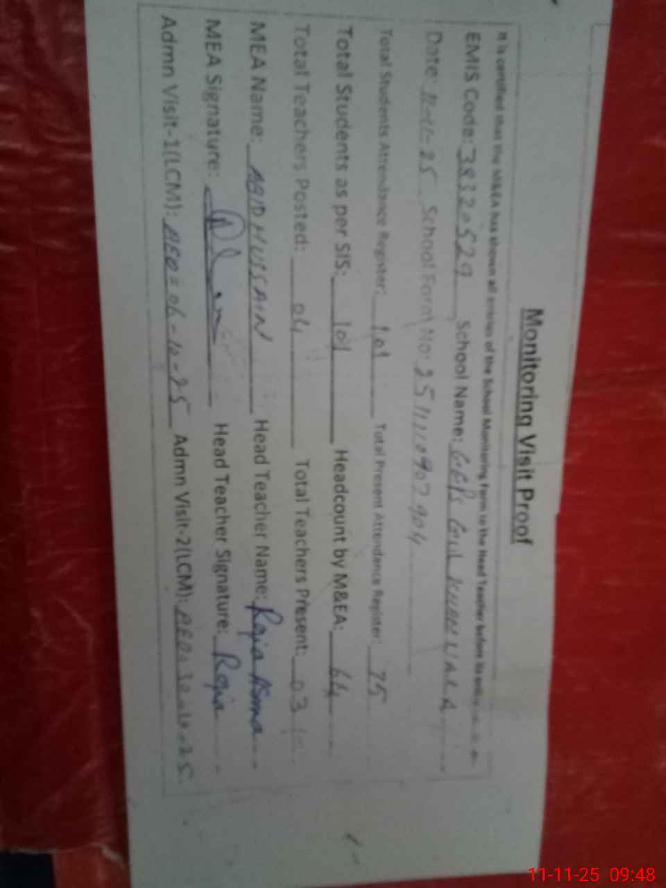 | Attendance Register | Head Teacher | MEA with School | Visit Proof |