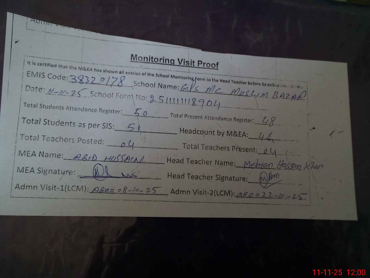 | Monitoring Date: 11-11-2025 | Start Time: 11-11-2025 11:18 AM | End Time: 11-11-2025 12:01 PM | Name of MEA: Ab**** Hu**** | |