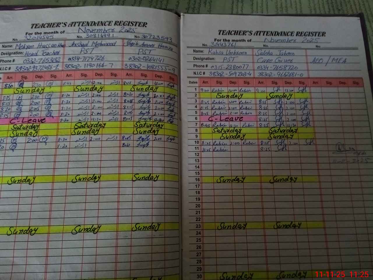 | CNIC | Full Name | Designation | R/C | Absence During Last Calender Month |