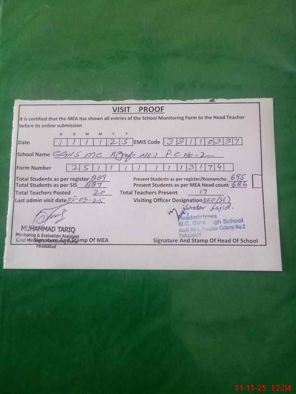 | EMIS Code: 33110337 | Name of School: GGHS MC AZAFI NO.1 PEOPLES COLONY NO.2 | |||