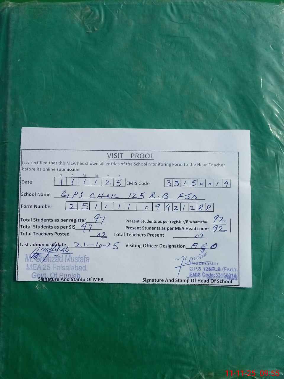 | Attendance Register | Head Teacher | MEA with School | Visit Proof |