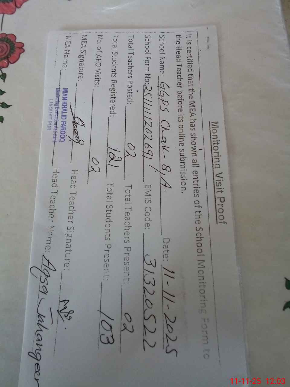 | Attendance Register | Head Teacher | MEA with School | Visit Proof |
