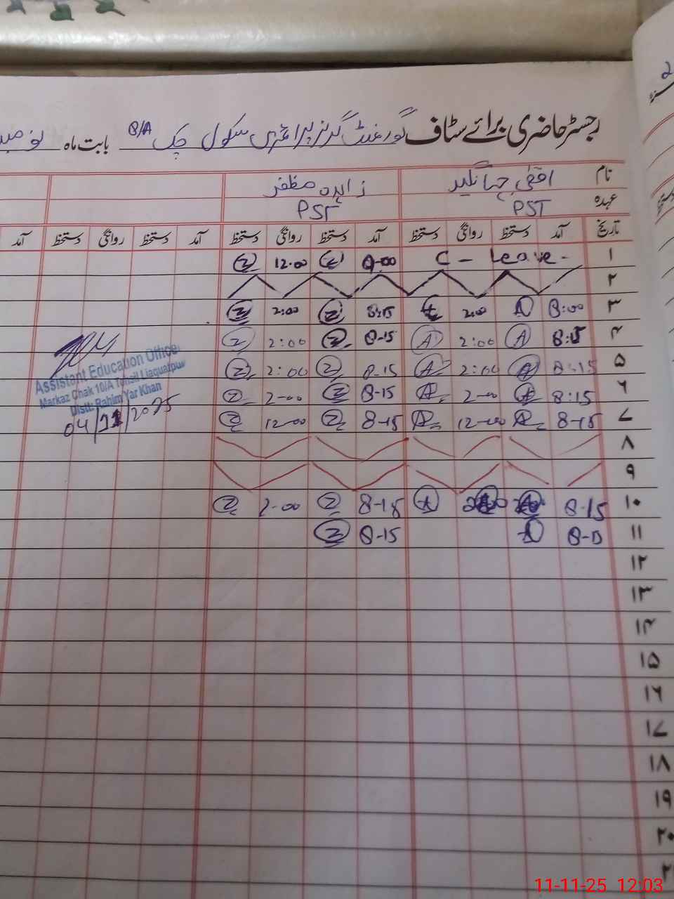 | CNIC | Full Name | Designation | R/C | Absence During Last Calender Month |