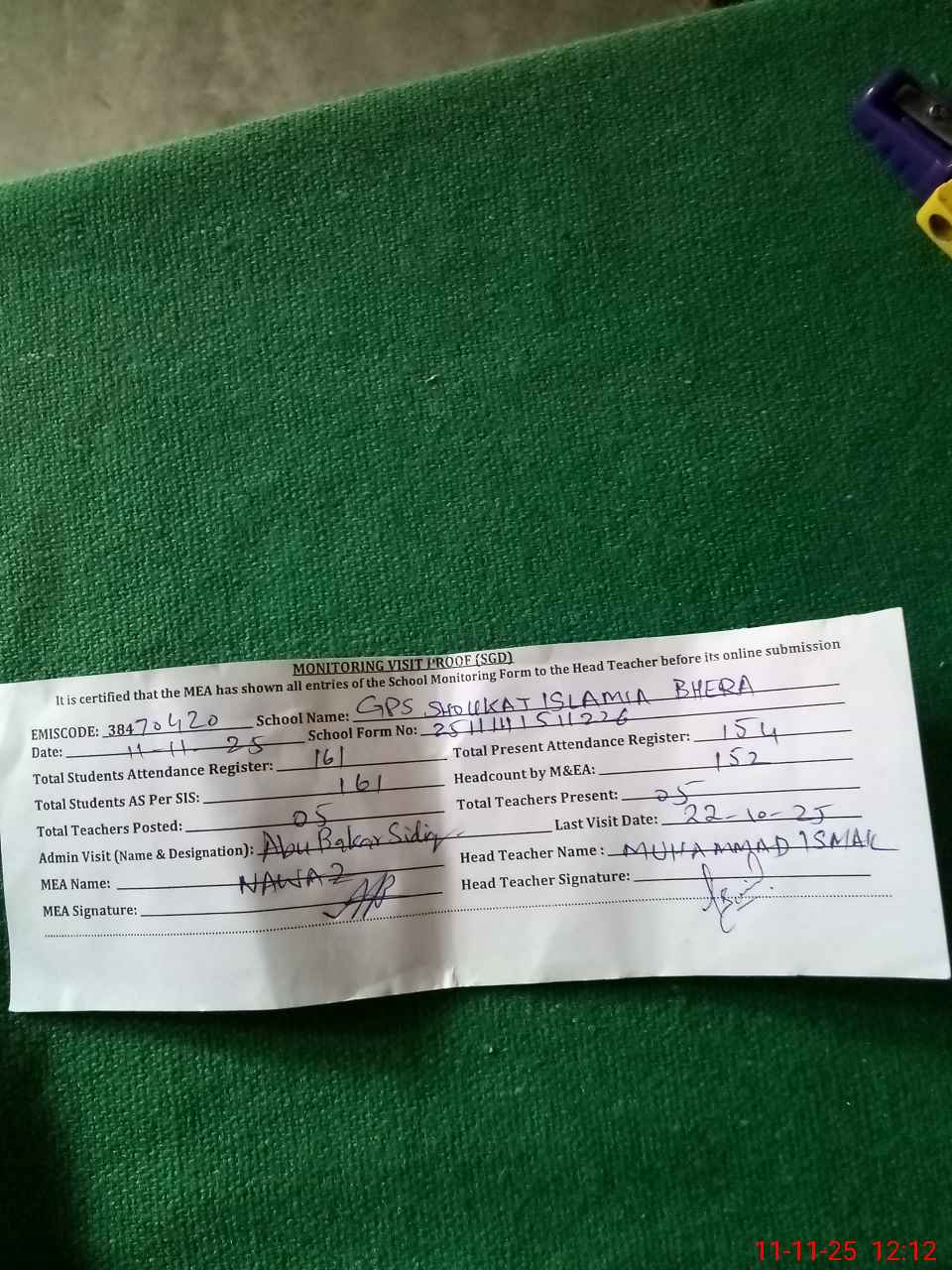 | Attendance Register | Head Teacher | MEA with School | Visit Proof |