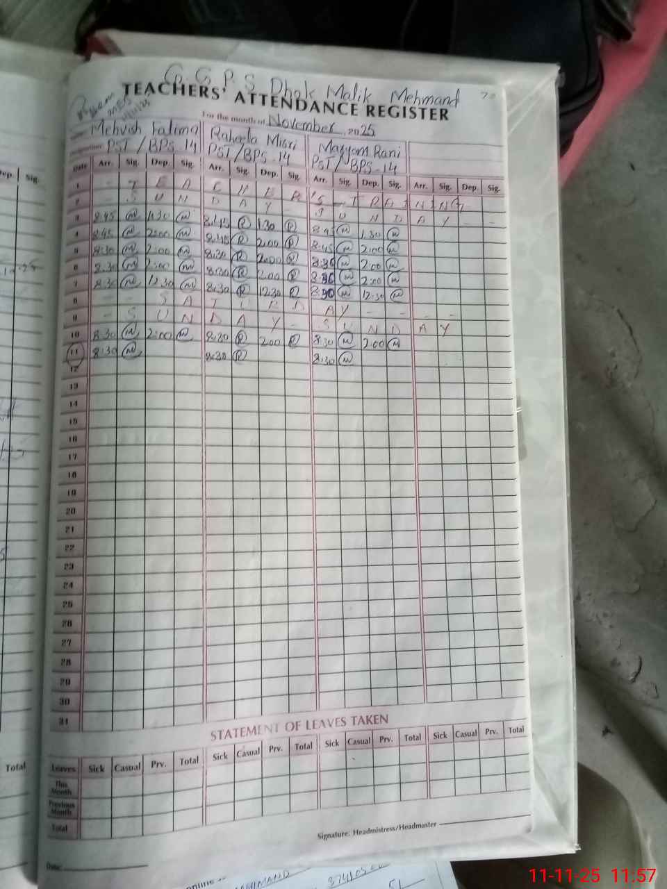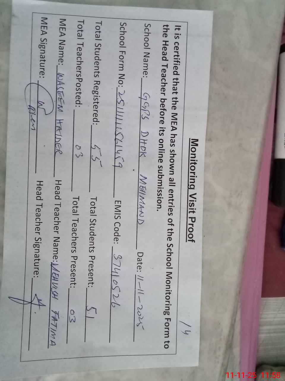 | Attendance Register | Head Teacher | MEA with School | Visit Proof |