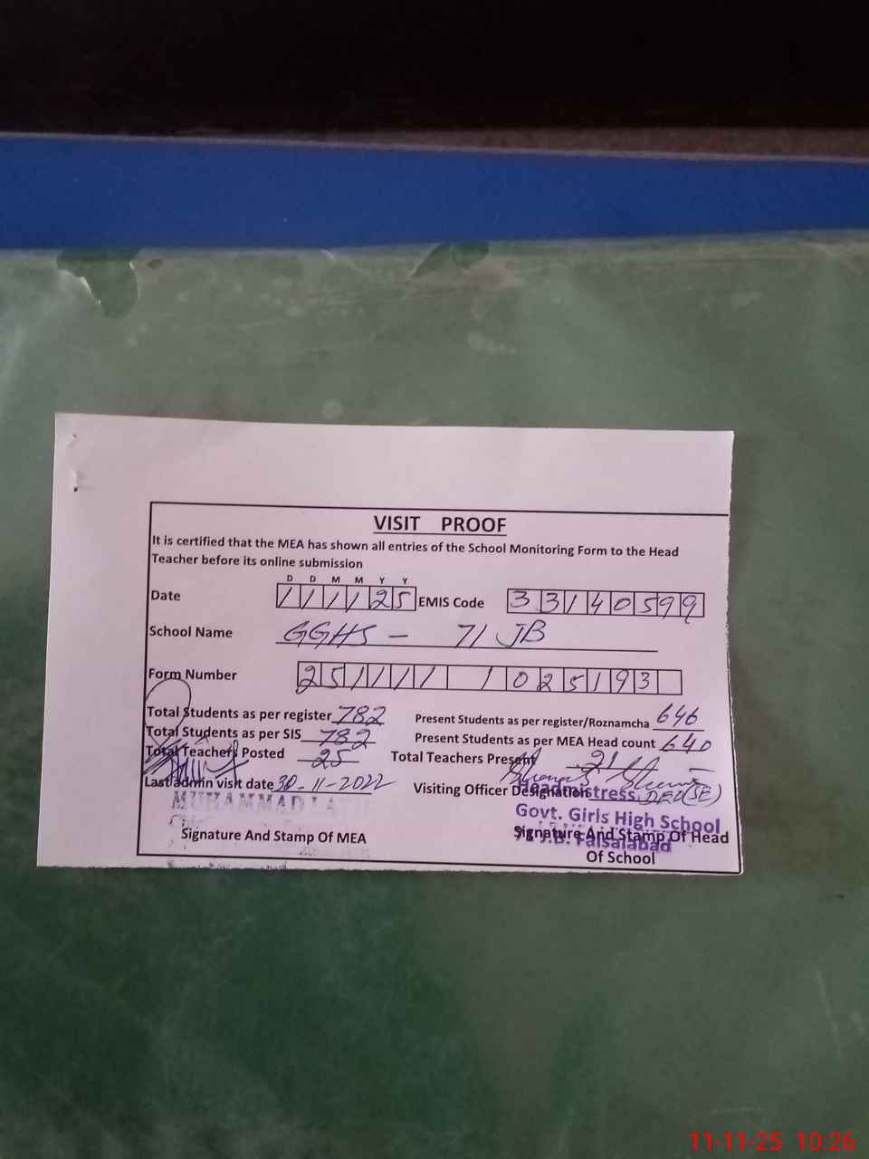 | EMIS Code: 33140599 | Name of School: GGHS CHAK NO. 71 JB FSD | |||