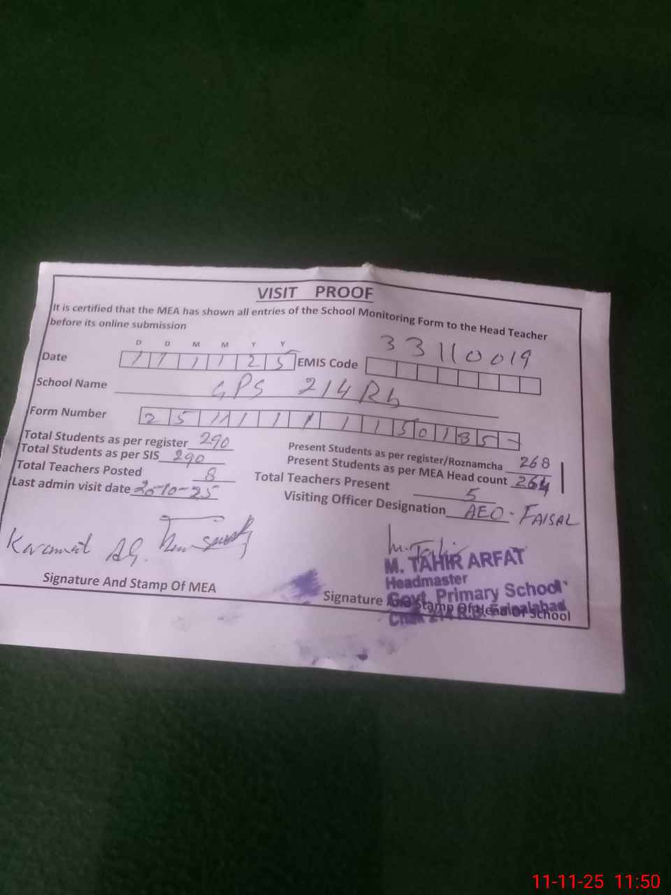| Attendance Register | Head Teacher | MEA with School | Visit Proof |