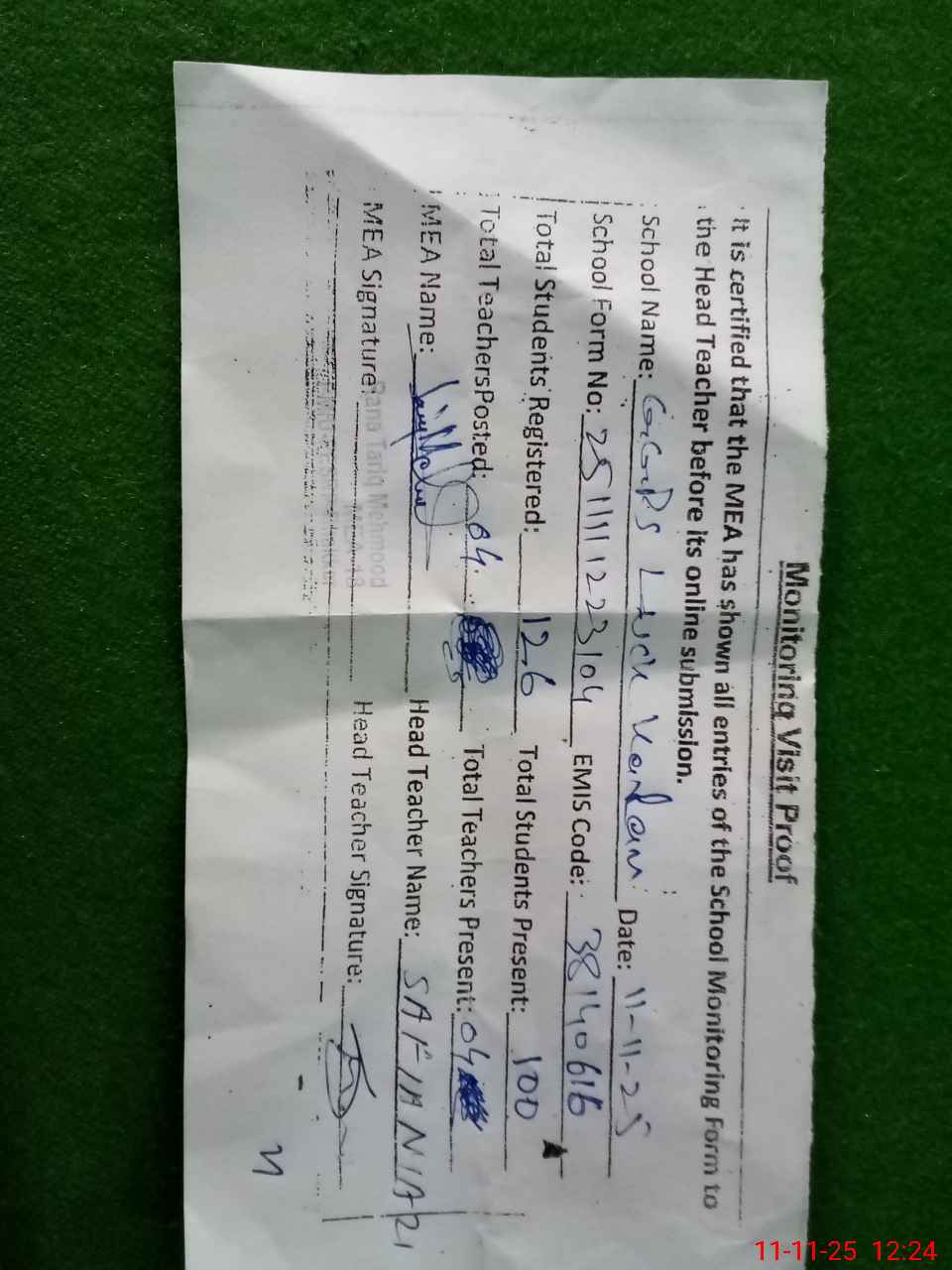 | Remarks (Use Separate Page if Required): Last visit of education authority 1 Designation AEO 2 Name Aqsa Maheen 3 Date of Visit 31 Oct 2025 | |||||