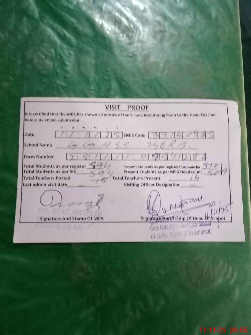 | Attendance Register | Head Teacher | MEA with School | Visit Proof |