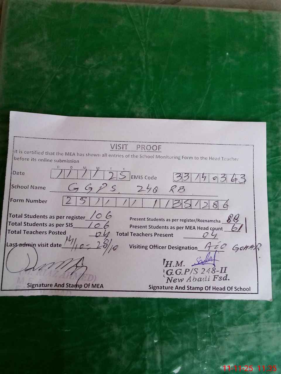 | Attendance Register | Head Teacher | MEA with School | Visit Proof |