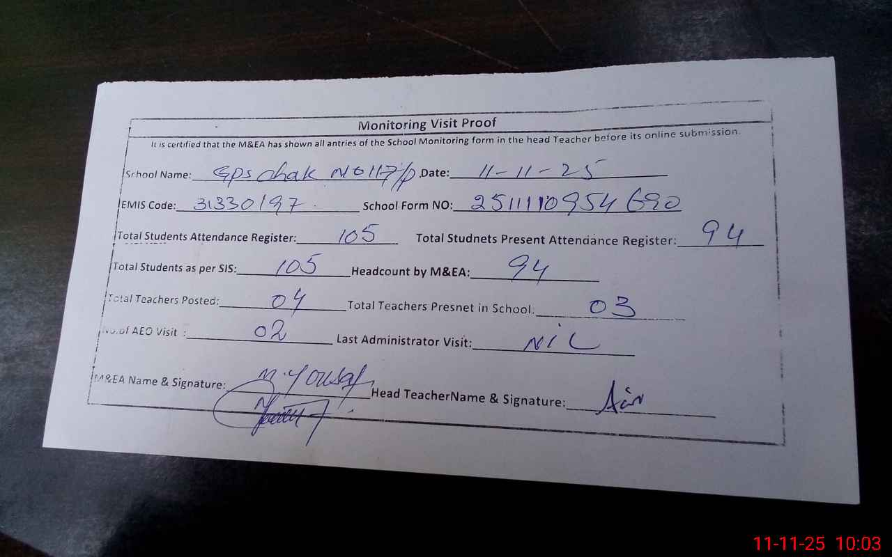 | Attendance Register | Head Teacher | MEA with School | Visit Proof |