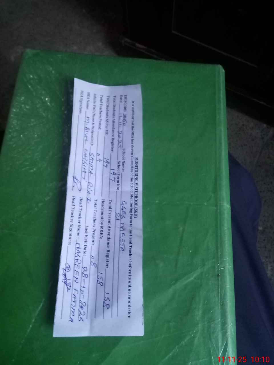 | Attendance Register | Head Teacher | MEA with School | Visit Proof |
