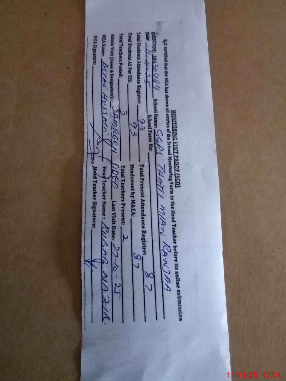 | Attendance Register | Head Teacher | MEA with School | Visit Proof |