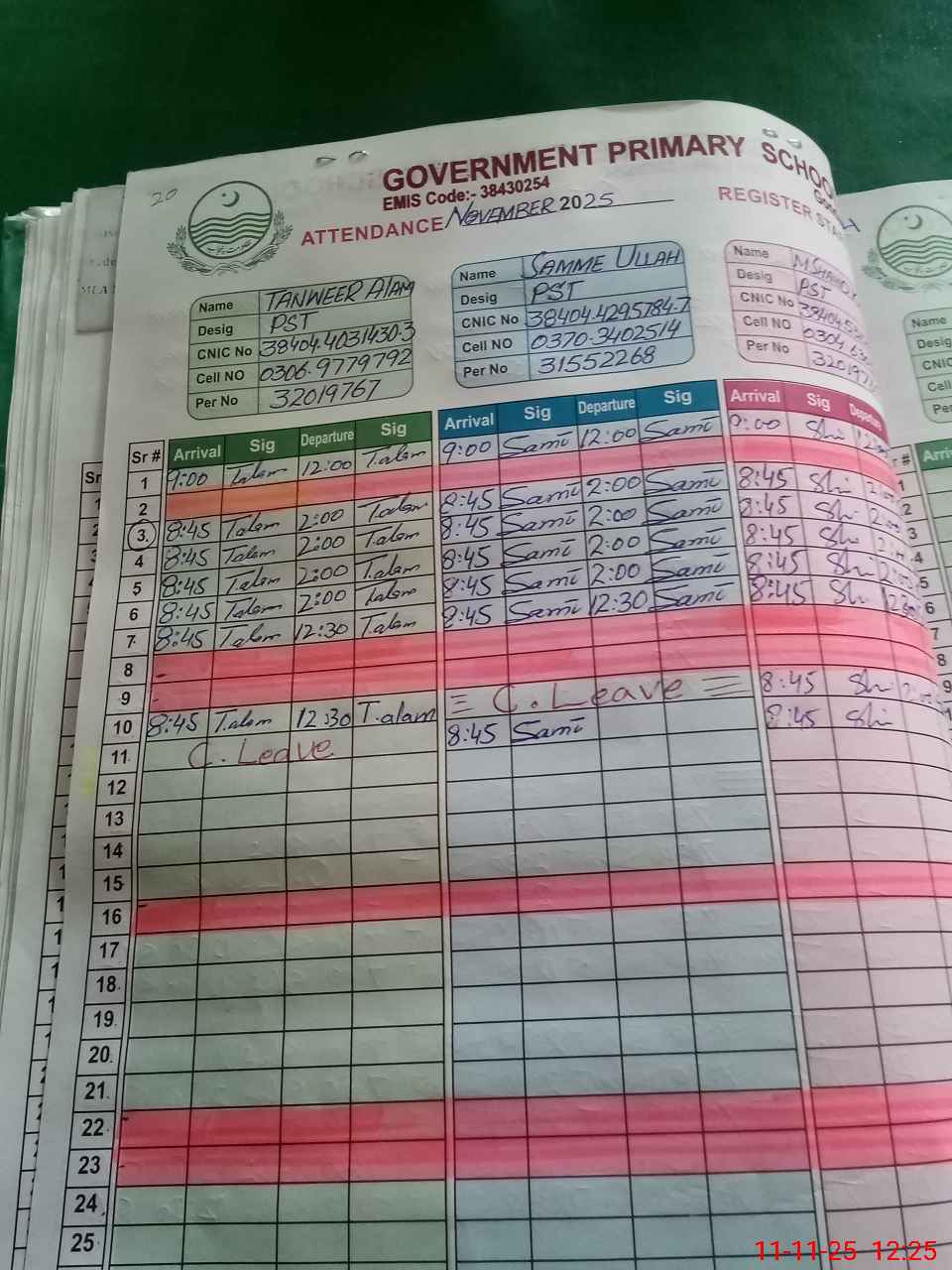 | CNIC | Full Name | Designation | R/C | Absence during last cal. month |