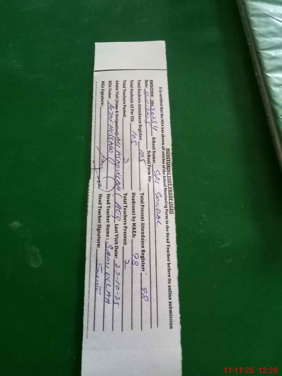 | Attendance Register | Head Teacher | MEA with School | Visit Proof |