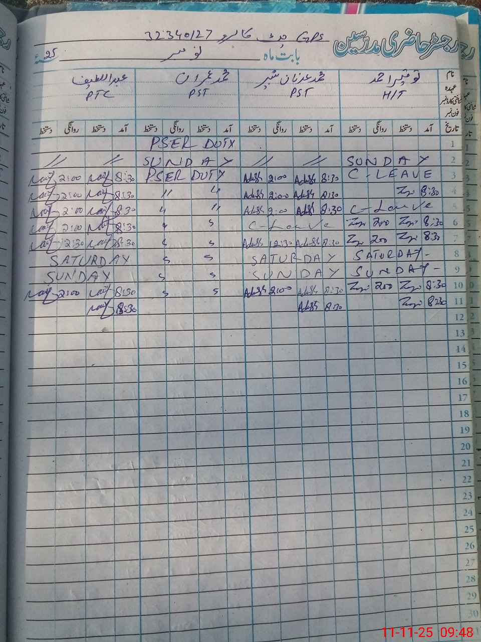 | CNIC | Full Name | Designation | R/C | Absence During Last Calender Month |