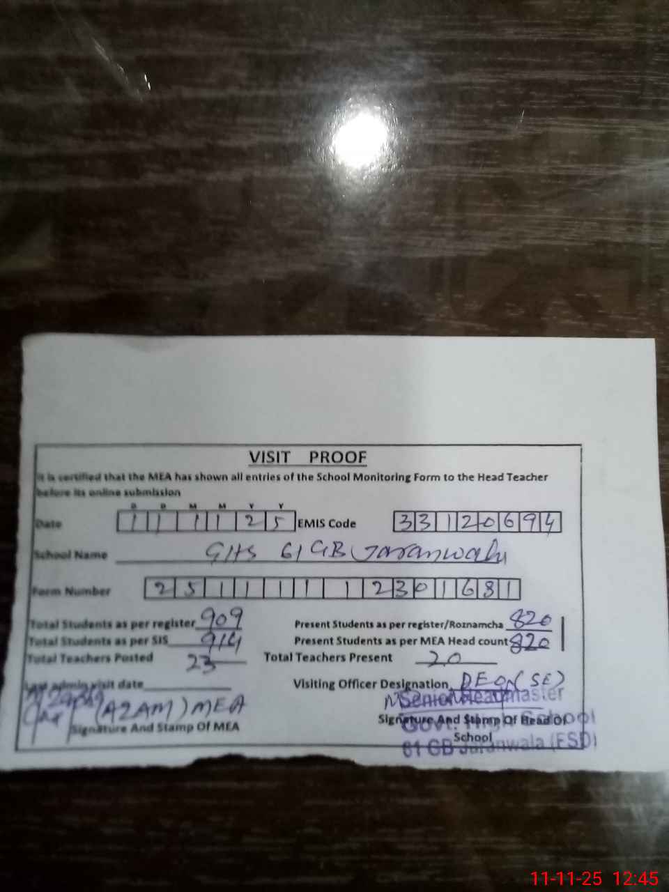 | Attendance Register | Head Teacher | MEA with School | Visit Proof |