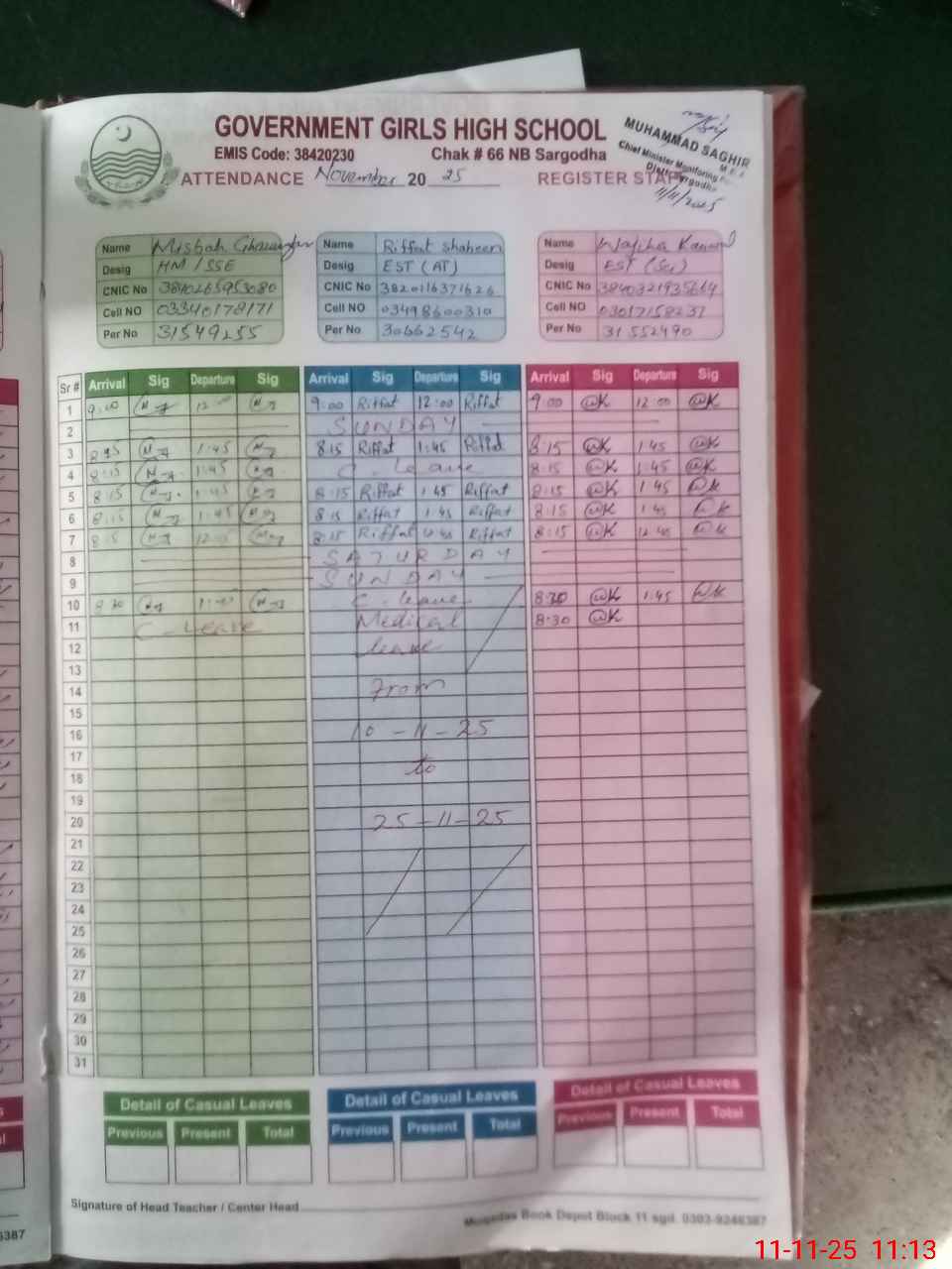 | CNIC | Full Name | Designation | R/C | Absence during last cal. month |