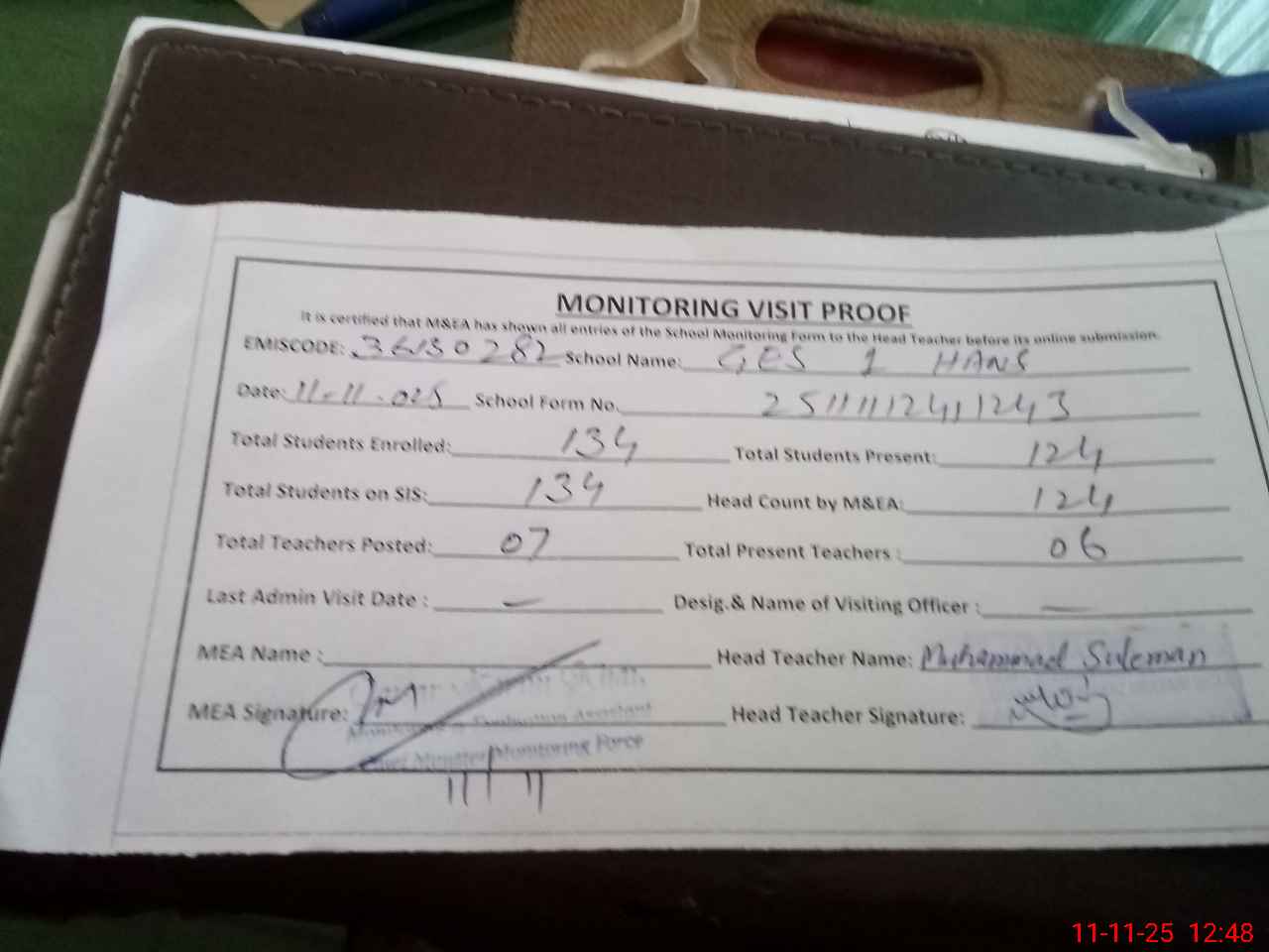 | EMIS Code: 36130282 | Name of School: GES CHAK NO.1 HANS P/O KOT MELA RAM | |||