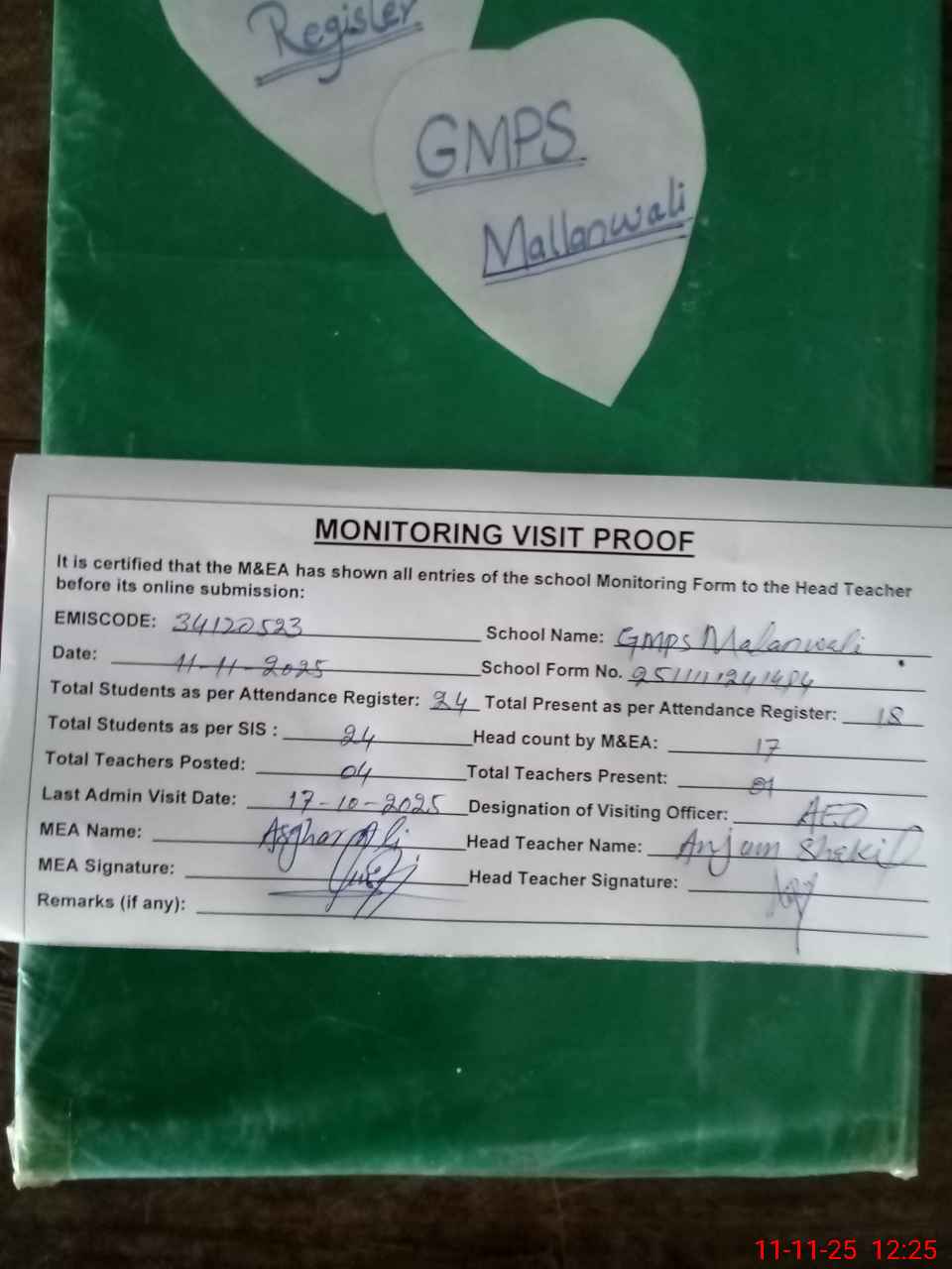 | Attendance Register | Head Teacher | MEA with School | Visit Proof |