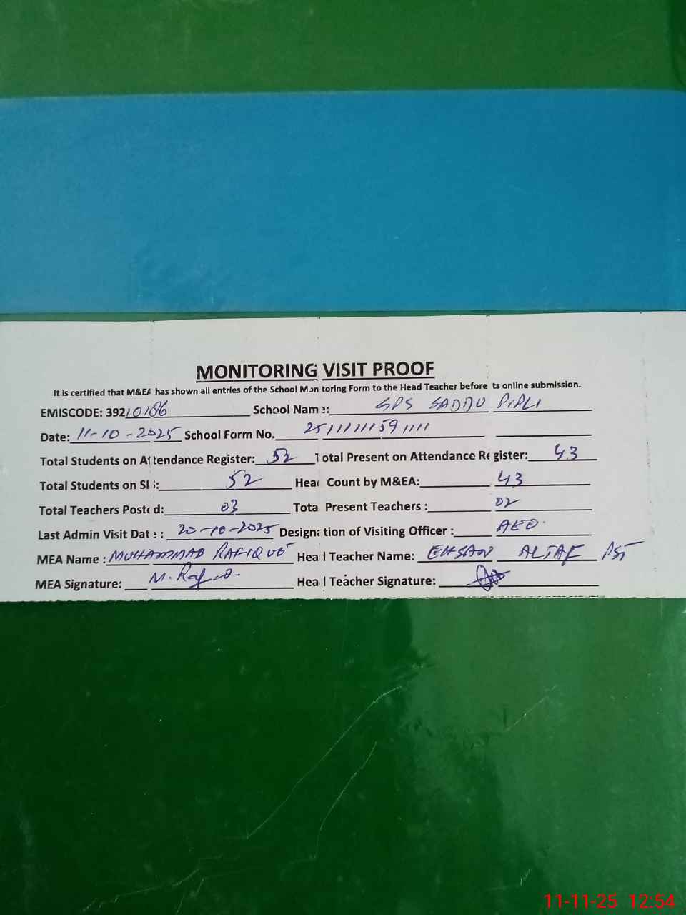 | Attendance Register | Head Teacher | MEA with School | Visit Proof |