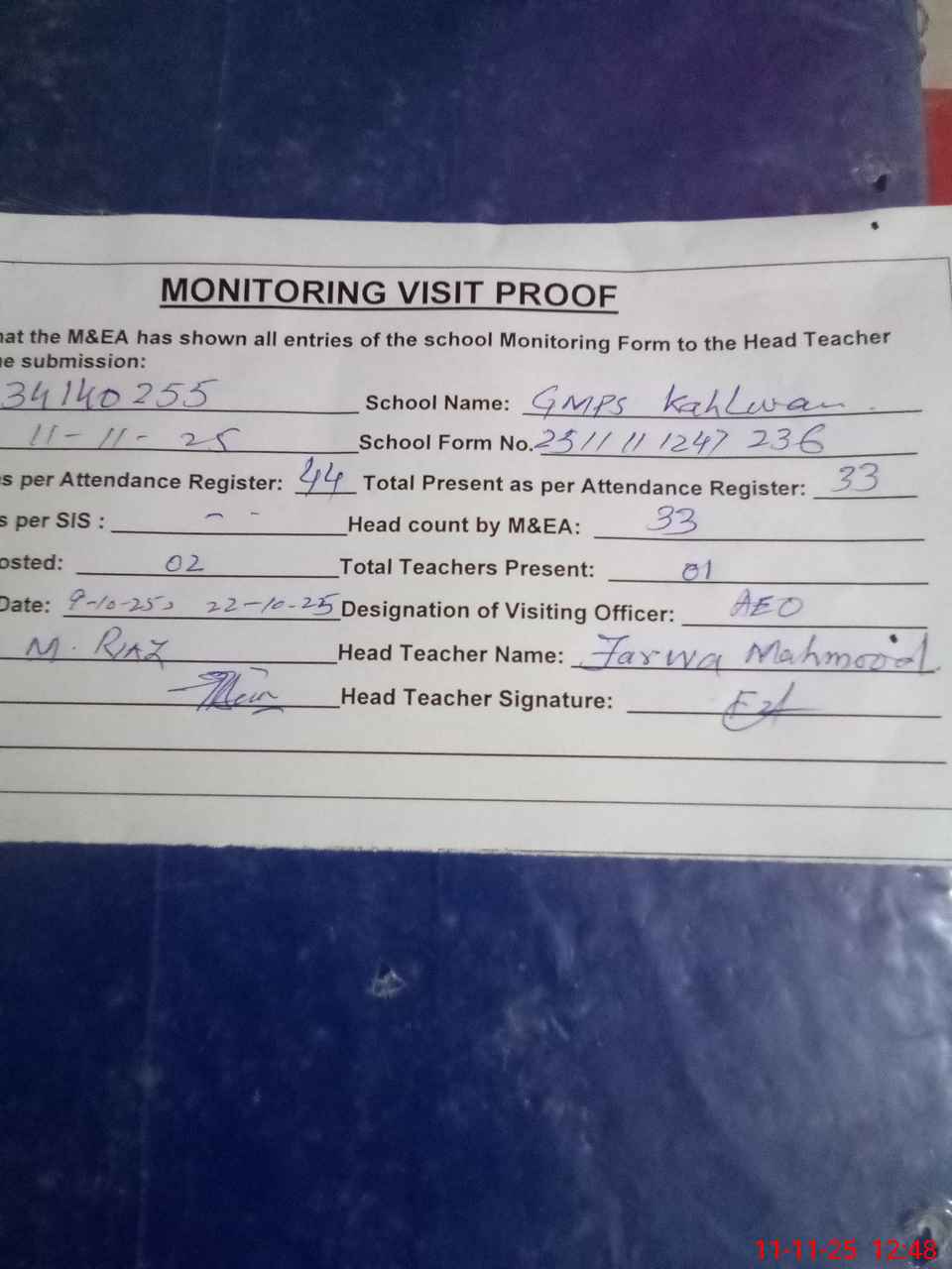 | Attendance Register | Head Teacher | MEA with School | Visit Proof |