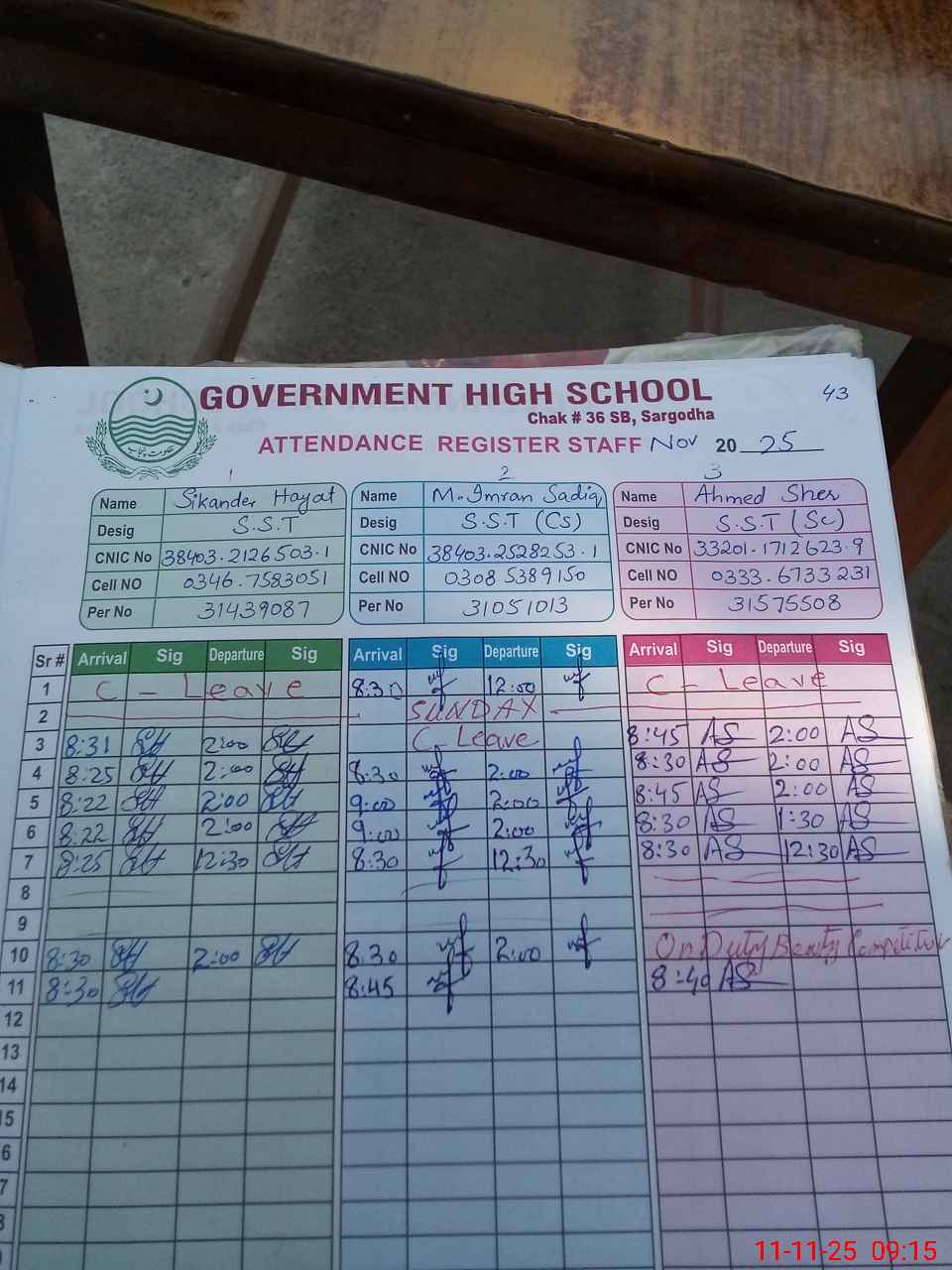 | CNIC | Full Name | Designation | R/C | Absence during last cal. month |