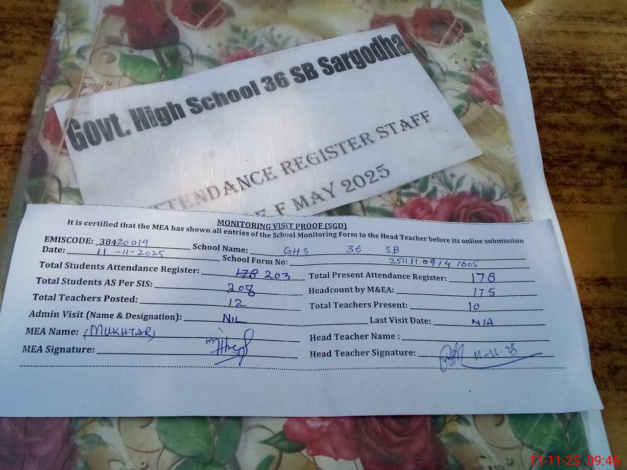 | Attendance Register | Head Teacher | MEA with School | Visit Proof |