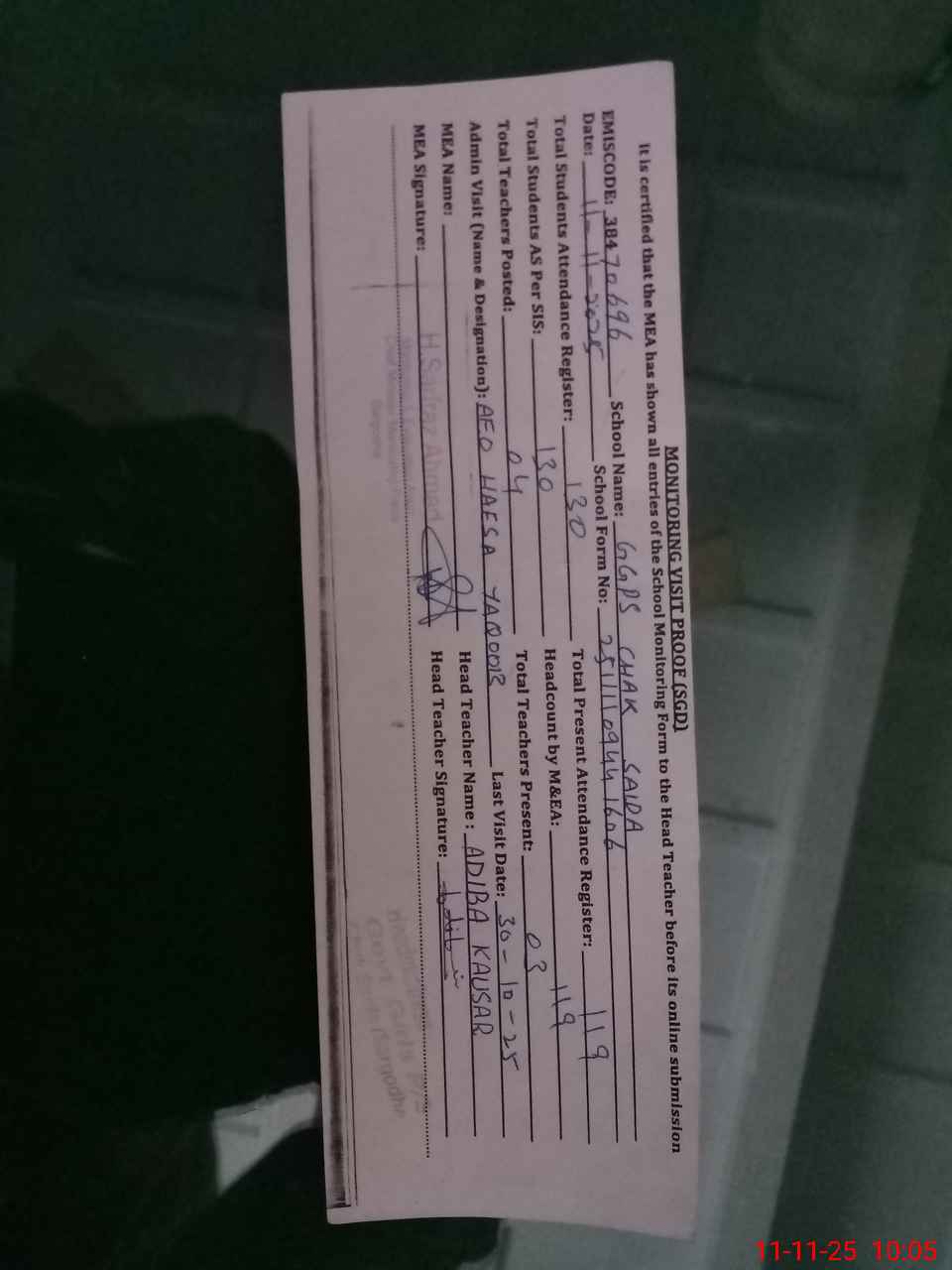 | Monitoring Date: 11-11-2025 | Start Time: 11-11-2025 09:49 AM | End Time: 11-11-2025 10:06 AM | Name of MEA: HA**** SA**** AH**** | |