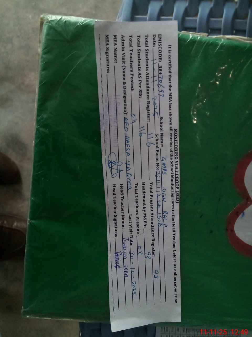 | Attendance Register | Head Teacher | MEA with School | Visit Proof |