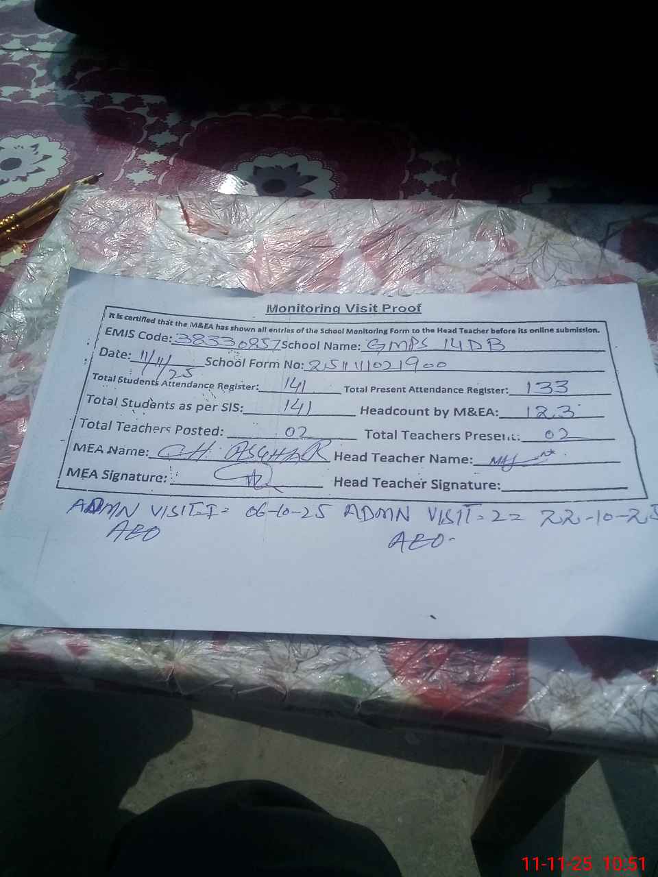 | Monitoring Date: 11-11-2025 | Start Time: 11-11-2025 10:20 AM | End Time: 11-11-2025 10:52 AM | Name of MEA: Mu**** As**** | |