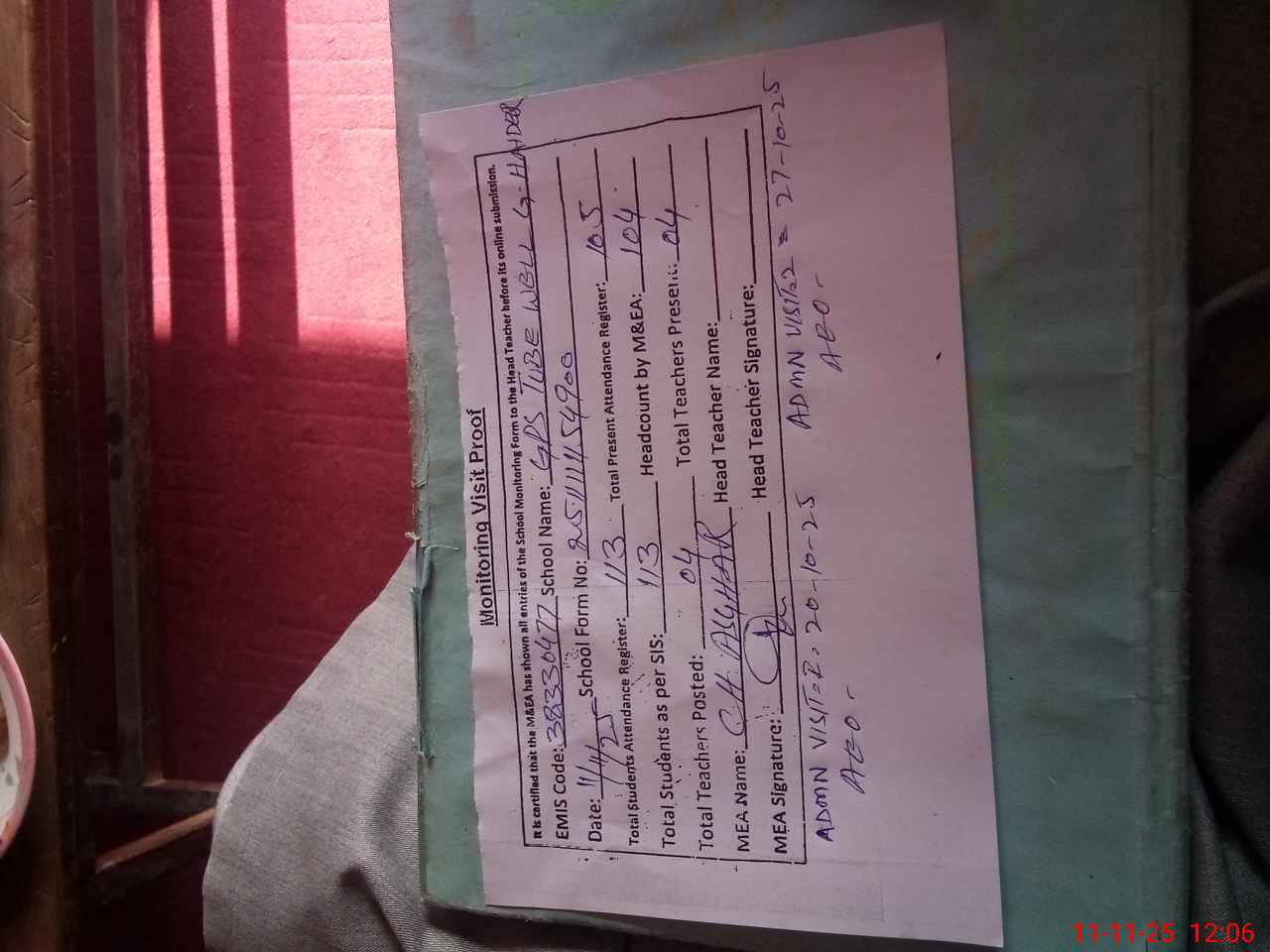 | Attendance Register | Head Teacher | MEA with School | Visit Proof |