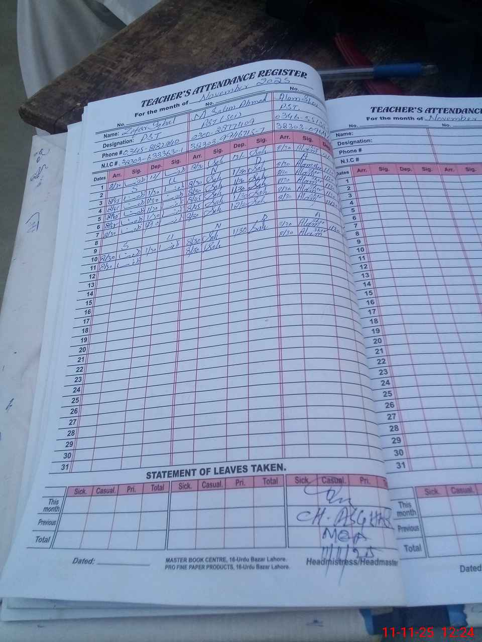 | CNIC | Full Name | Designation | R/C | Absence During Last Calender Month |