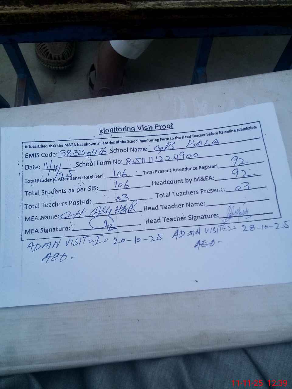 | Monitoring Date: 11-11-2025 | Start Time: 11-11-2025 12:20 PM | End Time: 11-11-2025 12:40 PM | Name of MEA: Mu**** As**** | |