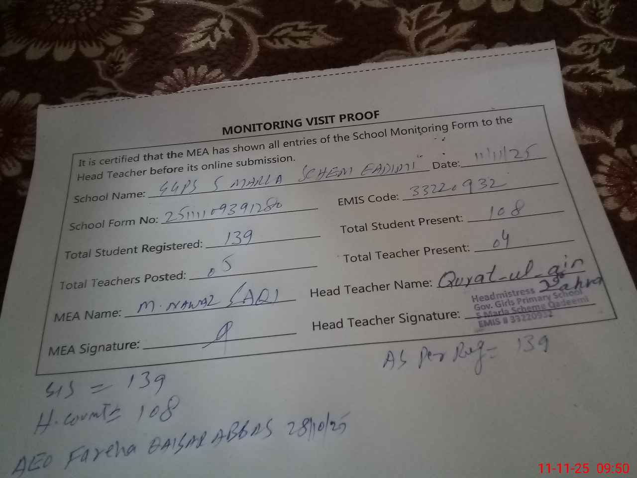 | EMIS Code: 33220932 | Name of School: GGPS 5 MARLA SCHEME QADIMI | |||
