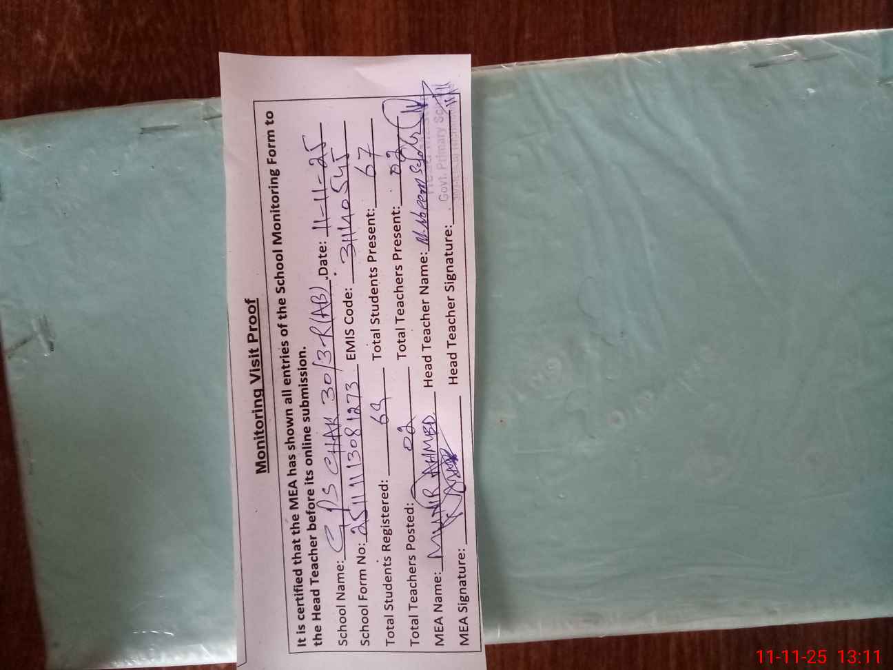 | Attendance Register | Head Teacher | MEA with School | Visit Proof |