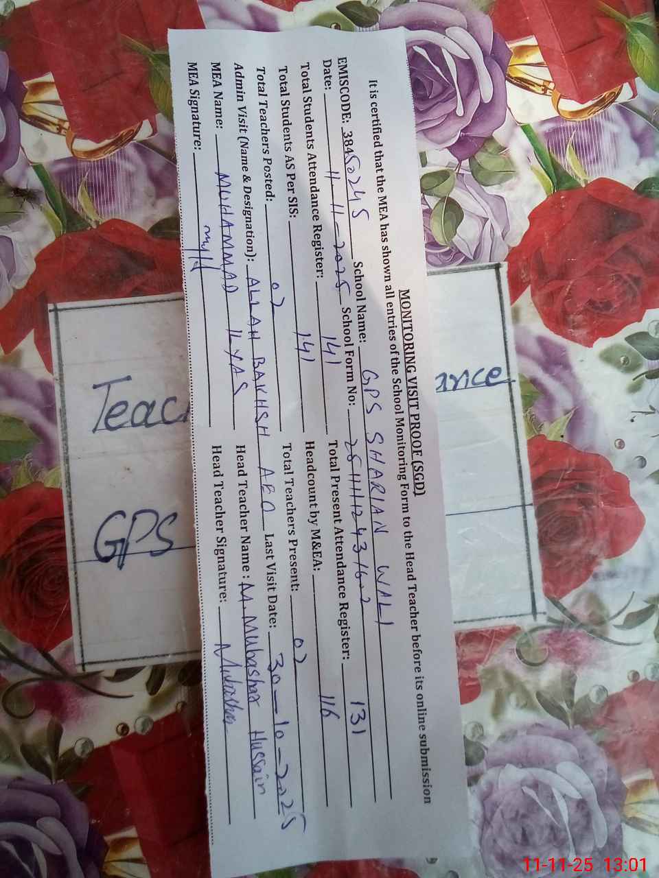 | EMIS Code: 38450245 | Name of School: GPS SHARIAN WALI | |||