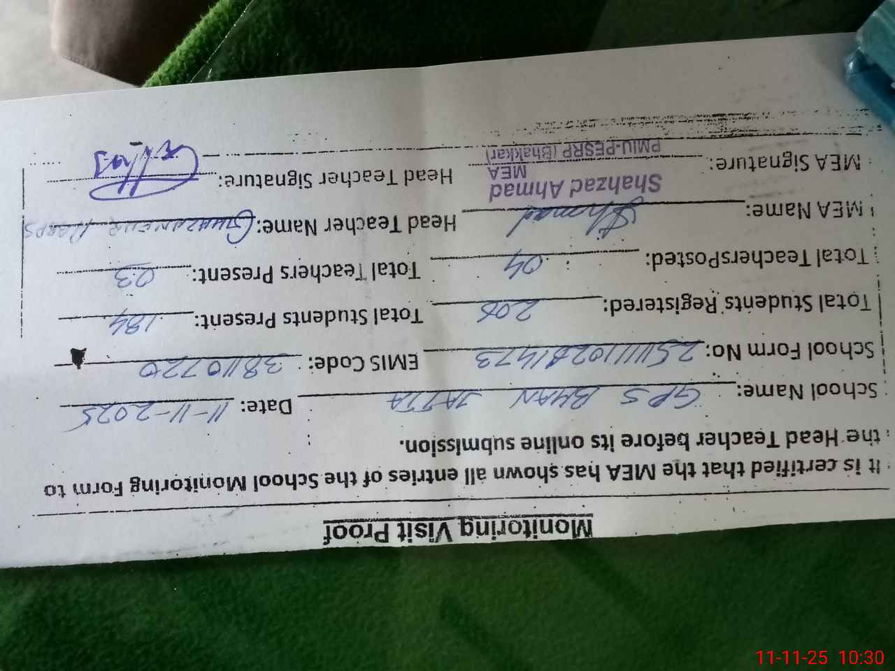 | Remarks (Use Separate Page if Required): Last visit Akhtar Abbas Samar AEO 22 October 2025 PST Toqeer Abbas is on PSER duty from 09 October 2025 without any authority letter | |||||