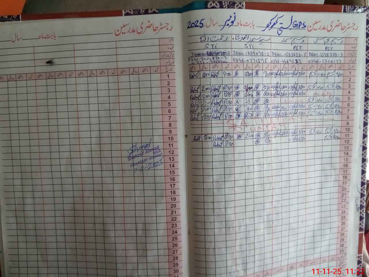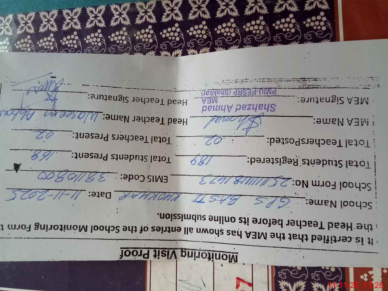 | Remarks (Use Separate Page if Required): Last visit Mushtaq Hussain AEO 28 October 2025 | |||||