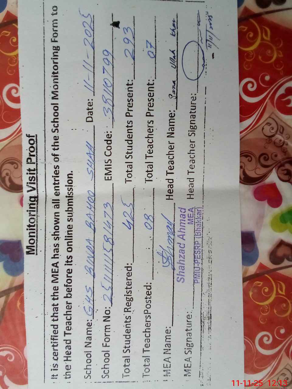 | Attendance Register | Head Teacher | MEA with School | Visit Proof |