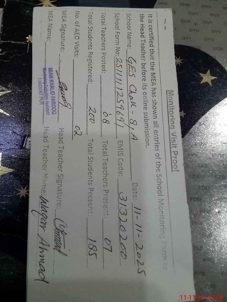| Attendance Register | Head Teacher | MEA with School | Visit Proof |