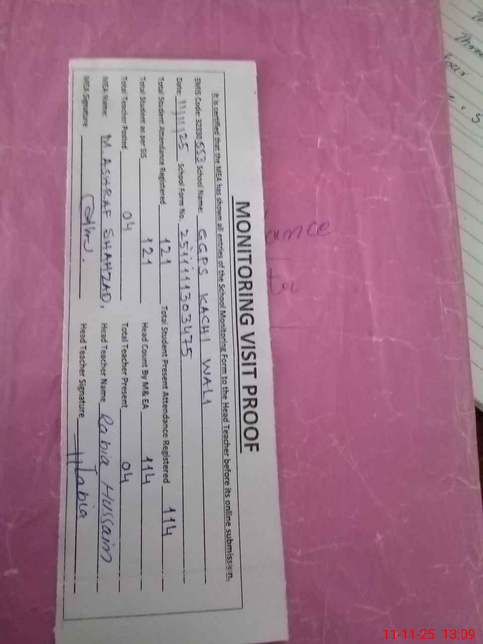 | Attendance Register | Head Teacher | MEA with School | Visit Proof |