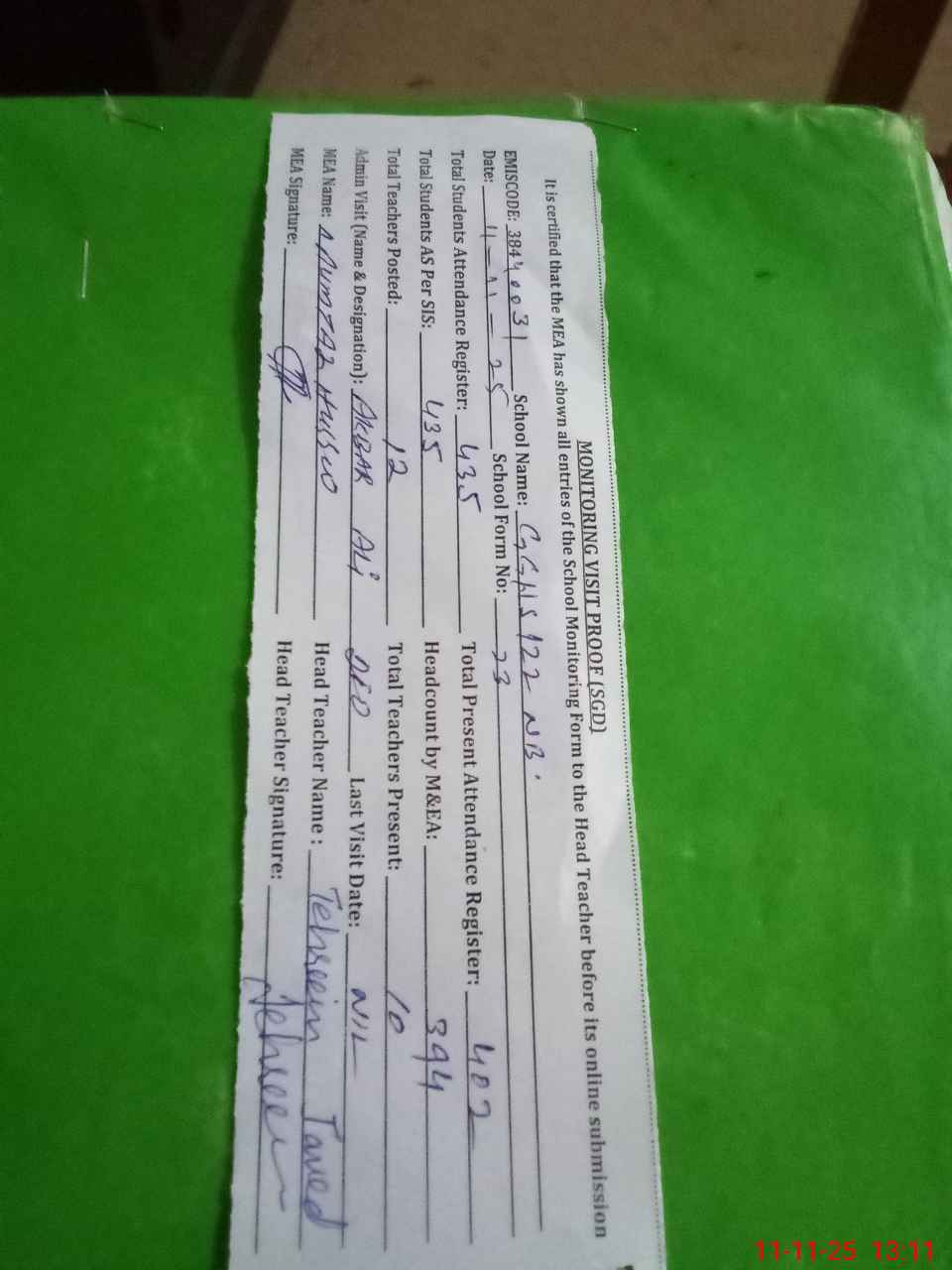 | Attendance Register | Head Teacher | MEA with School | Visit Proof |