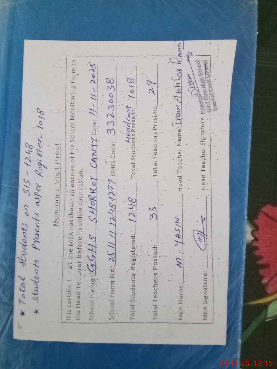 | EMIS Code: 33230038 | Name of School: GGHS SHORKOT CANTT | |||
