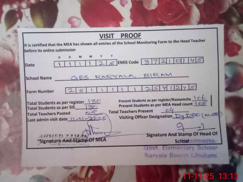 | Monitoring Date: 11-11-2025 | Start Time: 11-11-2025 12:39 PM | End Time: 11-11-2025 01:17 PM | Name of MEA: Ah**** Za**** | |