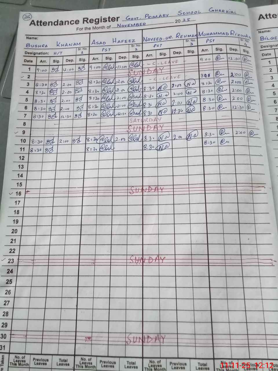 | CNIC | Full Name | Designation | R/C | Absence During Last Calender Month |