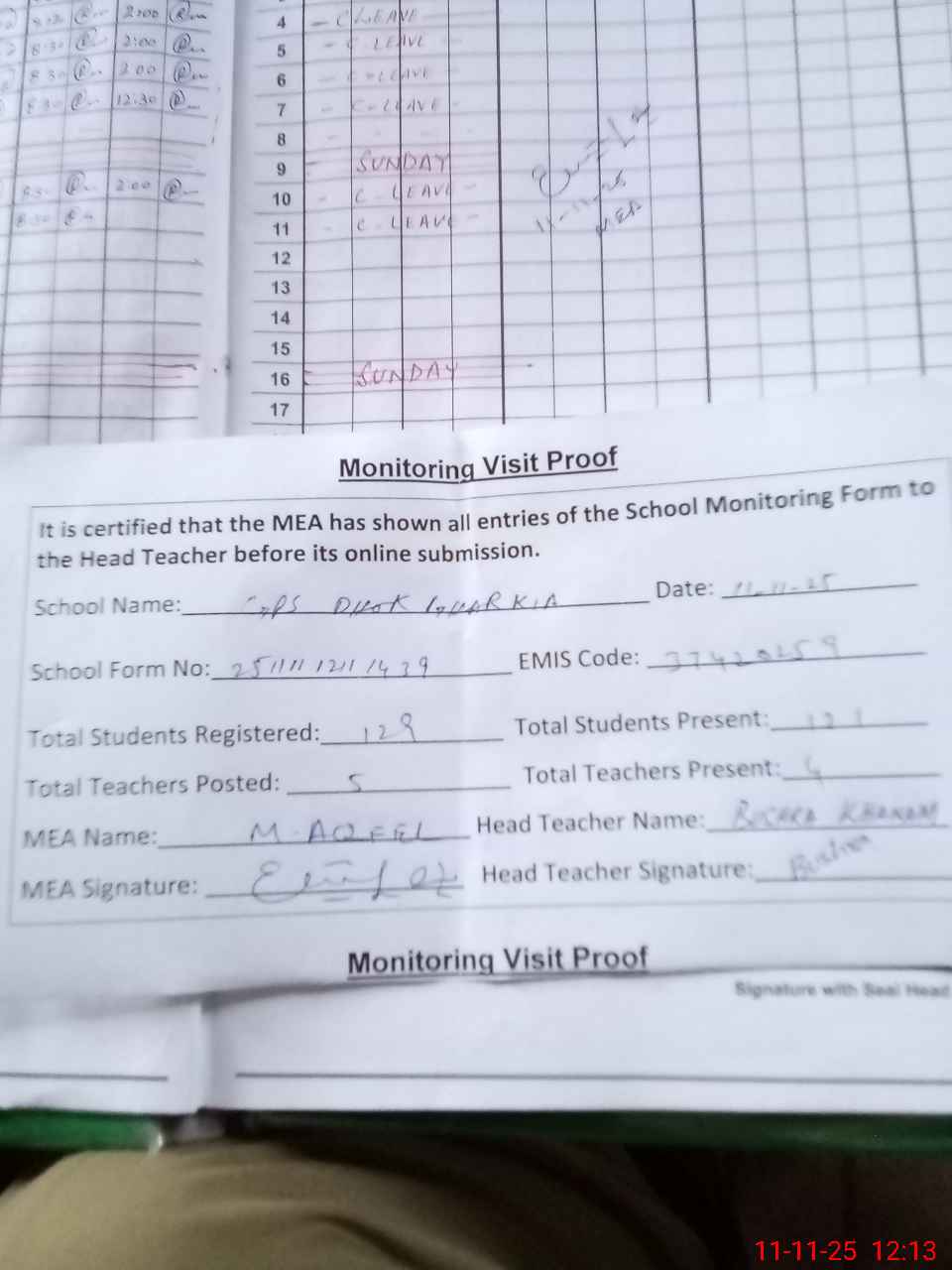 | Attendance Register | Head Teacher | MEA with School | Visit Proof |